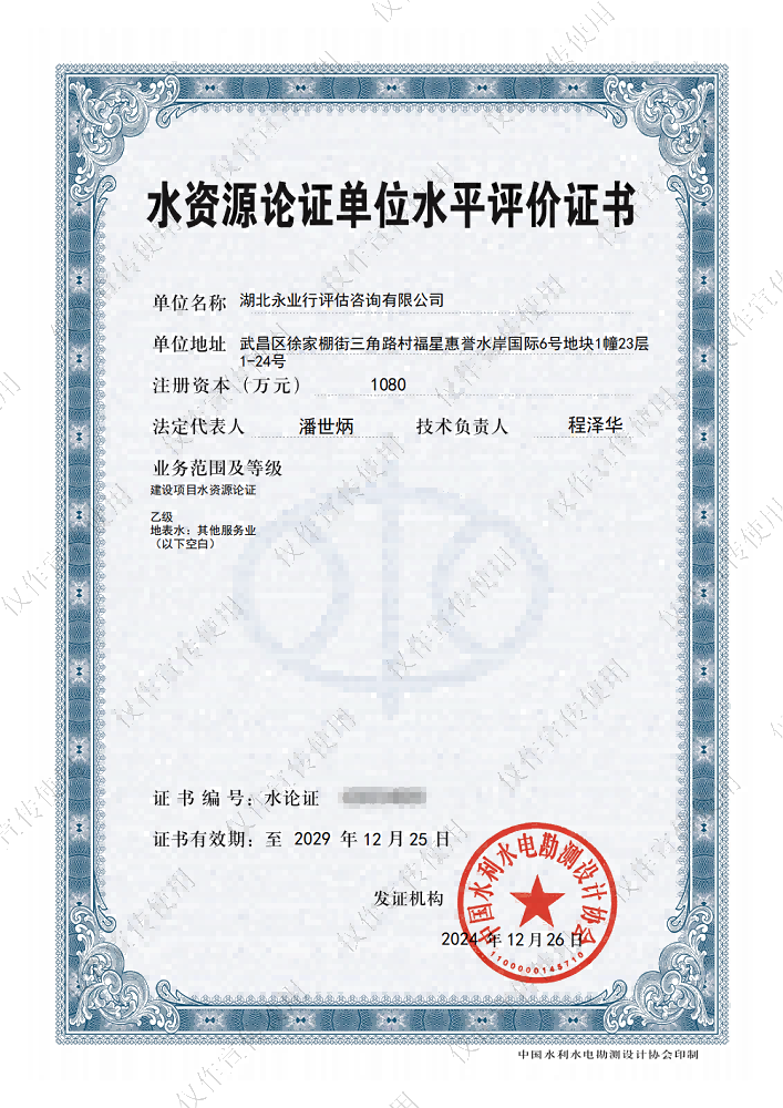 水资源论证单位水平评价证书