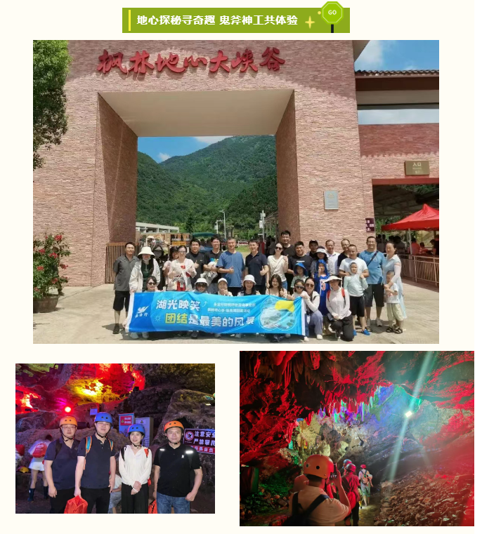 抵达枫林地心谷景区,大家换上防水雨靴、头盔深入溶洞开启探险之旅。18℃的恒温洞穴内别有洞天,潺潺流水沿岩壁蜿蜒而下形成天然溯溪路径,水滴击石的清脆声响与钟乳石的奇特造型相映成趣,大家在溯溪前行中直呼凉快。团队成员手挽手小心跨越湿滑步道,不时弯腰避开低垂的岩缝,家长则紧牵孩子的手耐心讲解钟乳石的形成原理。行至开阔处,大家驻足观赏“石幔垂挂”“石柱林立”的奇幻景观,用手机记录下自然造物的鬼斧神工,孩童们的惊叹声与大人的讲解声在溶洞中轻轻回荡,互助前行的身影成为洞内最美风景。