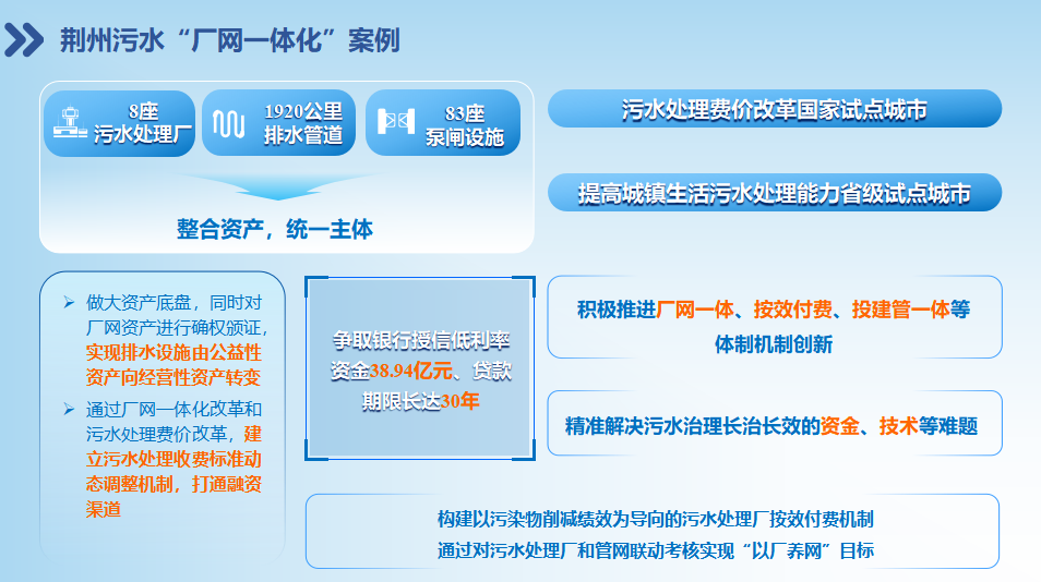 2022年起,针对地下管网老旧、管理权属不清、厂网运营管理分散等问题,我省打响了“管网攻坚战”。永业行以污水处理价格改革、按效付费机制构建等顶层设计为切入点,协助各级政府及主管部门积极探索,逐一破解厂网资产归集、管网确权、确值入账、模式创新、投建营一体等堵点难点;走出了“厂网一体+使用者付费+按效付费”的长效治污新路子,实现了厂网资源资产化、授权授信资金化、投建管运一体化、整体运行市场化;系统解决了以往城镇排水设施建管分离、责任不清、运维质效低下、资金筹措渠道不畅等问题。2025年8月,荆州市不动产登记中心发出了全省第一张管网不动产登记证书,有力推动了管网价值“无形变有形”,助力实施主体成功争取了政策性银行“长周期、低利率”融资授信。